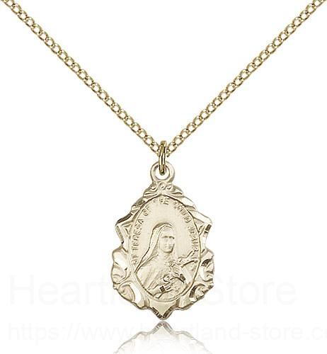 This St. Theresa Medal is paired with an 18" gold filled light curb chain as pictured. All medals are gift boxed in a light blue velvet gift box ready for gift giving.