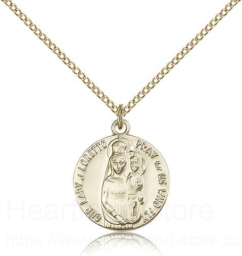 This Our Lady of Loretto Medal is paired with an 18" gold filled light curb chain as pictured. All medals are gift boxed in a light blue velvet gift box ready for gift giving.