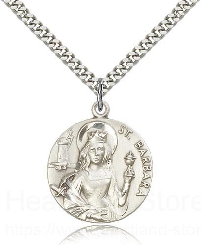 This St. Barbara Medal is paired with a 24 inch stainless steel heavy curb chain as pictured. All medals are gift boxed in a light blue velvet jewelry box ready for gift giving.