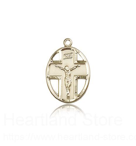 This Crucifix Pendant is made of 14 Karat Gold. The jewelry pendant is sold as pictured and does not come with a chain. All medals are gift boxed in a light blue velvet jewelry box ready for gift giving.