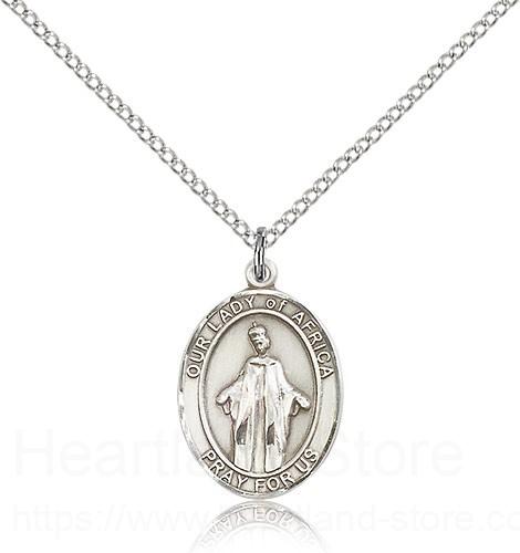 This Our Lady of Africa Pendant is made of sterling silver and is approximately the size of a nickel. The jewelry pendant is paired with an 18 inch sterling silver light curb chain as pictured. All medals are gift boxed in a beautiful blue velvet hinged jewelry gift box.