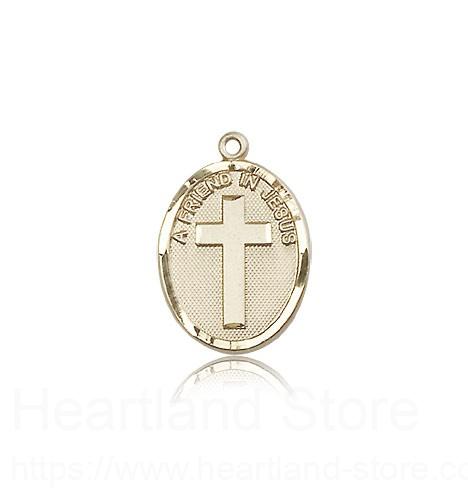 This A Friend In Jesus Medal is made of 14 Karat Gold. The jewelry pendant is sold as pictured and does not come with a chain. All medals are gift boxed in a light blue velvet jewelry box ready for gift giving.