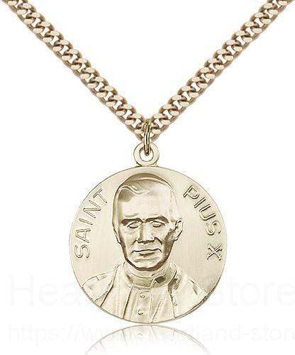 This Pope Pius X Medal is paired with a 24 inch stainless steel gold-tone heavy curb chain as pictured. All medals are gift boxed in a light blue velvet jewelry box ready for gift giving.
