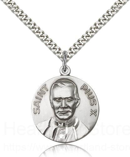This Pope Pius X Medal is paired with a 24 inch stainless steel heavy curb chain as pictured. All medals are gift boxed in a light blue velvet jewelry box ready for gift giving.