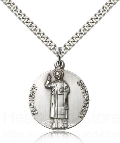 This St. Stephen Medal is paired with a 24 inch stainless steel heavy curb chain as pictured. All medals are gift boxed in a light blue velvet jewelry box ready for gift giving.