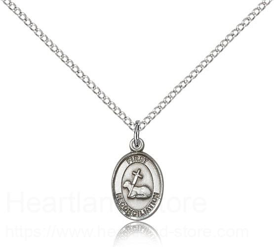 This First Reconciliation Medal is paired with an 18 inch sterling silver lite curb chain as pictured. All medals are gift boxed in a light blue velvet jewelry box ready for gift giving.