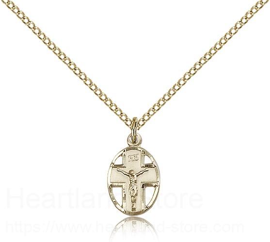 This Crucifix Pendant is paired with an 18" gold filled light curb chain as pictured. All medals are gift boxed in a light blue velvet gift box ready for gift giving.