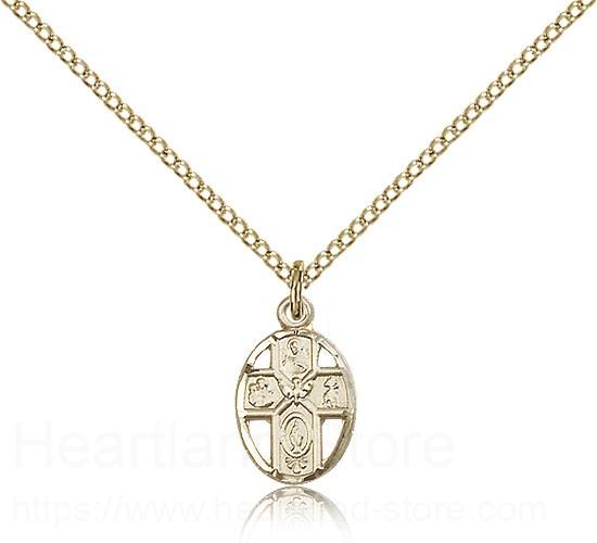 This 5 Way Cross Pendant is paired with an 18" gold filled light curb chain as pictured. All medals are gift boxed in a light blue velvet gift box ready for gift giving.