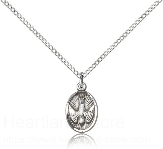 This Holy Spirit Medal is paired with an 18 inch sterling silver lite curb chain as pictured. All medals are gift boxed in a light blue velvet jewelry box ready for gift giving.
