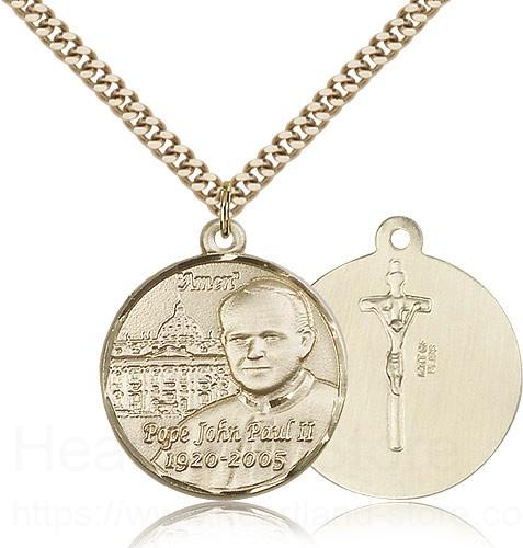 This Pope John Paul II Vatican Medal is paired with a 24 inch stainless steel gold-tone heavy curb chain as pictured. All medals are gift boxed in a light blue velvet jewelry box ready for gift giving.