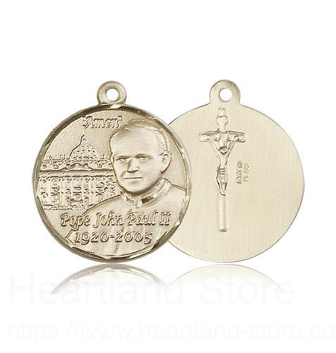 This Pope John Paul II Vatican Medal is made of 14 Karat Gold. The jewelry pendant is sold as pictured and does not come with a chain. All medals are gift boxed in a light blue velvet jewelry box ready for gift giving.