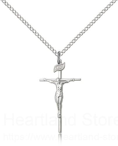 This Crucifix Pendant is paired with an 18 inch sterling silver lite curb chain as pictured. All medals are gift boxed in a light blue velvet jewelry box ready for gift giving.