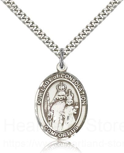 This Our Lady of Consolation Pendant is made of sterling silver and is approximately the size of a quarter. The jewelry pendant is paired with a 24 inch stainless steel heavy curb chain as pictured. All medals are gift boxed in a beautiful blue velvet hinged jewelry gift box.