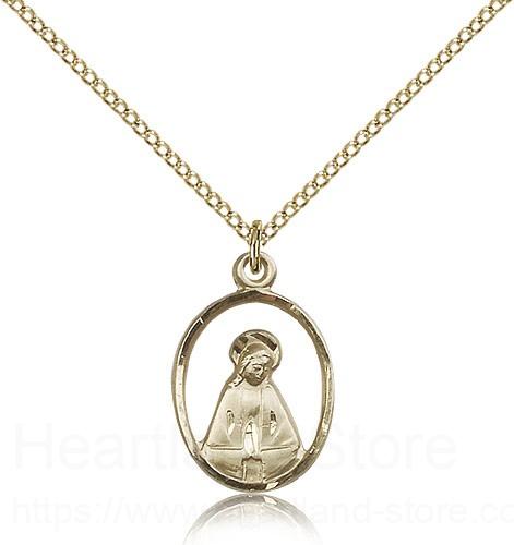 This Madonna Medal is paired with an 18" gold filled light curb chain as pictured. All medals are gift boxed in a light blue velvet gift box ready for gift giving.