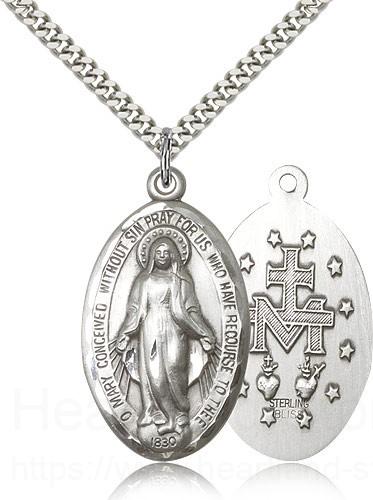 This Miraculous Medal is paired with a 24 inch stainless steel heavy curb chain as pictured. All medals are gift boxed in a light blue velvet jewelry box ready for gift giving.