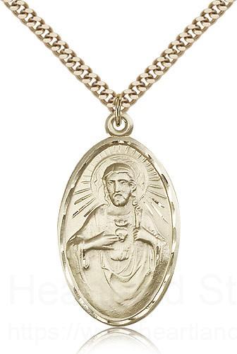 This Scapular Medal is paired with a 24 inch stainless steel gold-tone heavy curb chain as pictured. All medals are gift boxed in a light blue velvet jewelry box ready for gift giving.