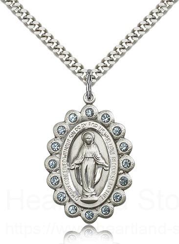 This Miraculous Medal is paired with a 24 inch stainless steel heavy curb chain as pictured. Beautiful light blue Swarovski crystals outline the medal. All medals are gift boxed in a light blue velvet jewelry box ready for gift giving.