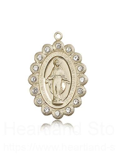 This Miraculous Medal is made of 14 Karat Gold. The jewelry pendant is sold as pictured and does not come with a chain. All medals are gift boxed in a light blue velvet jewelry box ready for gift giving.
