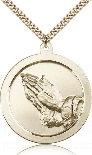 This Praying Hand Medal is paired with a 24 inch stainless steel gold-tone heavy curb chain as pictured. All medals are gift boxed in a light blue velvet jewelry box ready for gift giving.