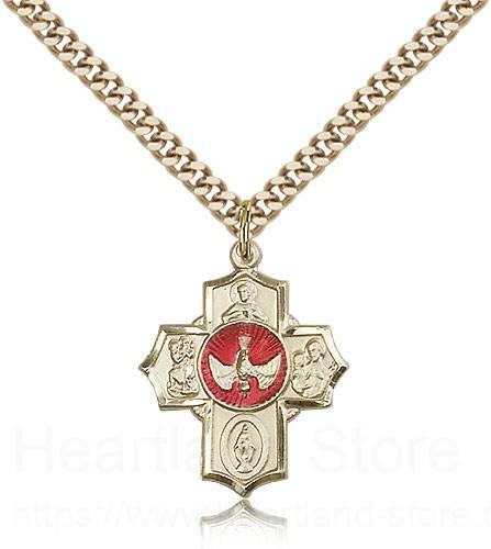 This 5 Way Cross Pendant is paired with a 24 inch stainless steel gold-tone heavy curb chain as pictured. All medals are gift boxed in a light blue velvet jewelry box ready for gift giving.