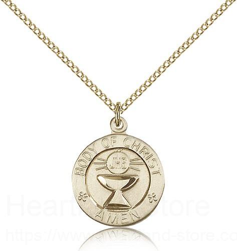 This Body of Christ Medal is paired with an 18" gold filled light curb chain as pictured. All medals are gift boxed in a light blue velvet gift box ready for gift giving.