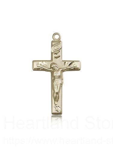 This Crucifix Pendant is made of 14 Karat Gold. The jewelry pendant is sold as pictured and does not come with a chain. All medals are gift boxed in a light blue velvet jewelry box ready for gift giving.