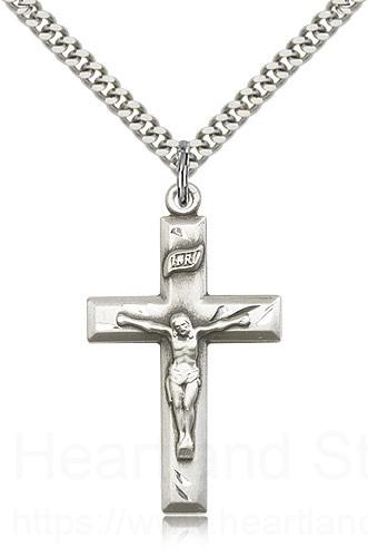 This Crucifix Pendant is paired with a 24 inch stainless steel heavy curb chain as pictured. All medals are gift boxed in a light blue velvet jewelry box ready for gift giving.