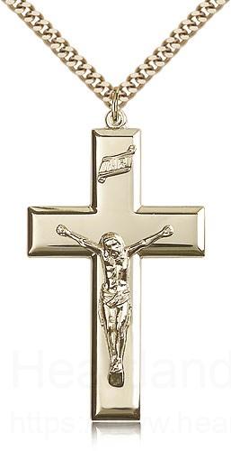 This Crucifix Pendant is paired with a 24 inch stainless steel gold-tone heavy curb chain as pictured. All medals are gift boxed in a light blue velvet jewelry box ready for gift giving.