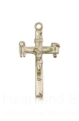 This Crucifix Pendant is made of 14 Karat Gold. The jewelry pendant is sold as pictured and does not come with a chain. All medals are gift boxed in a light blue velvet jewelry box ready for gift giving.