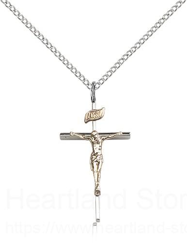 This Crucifix Pendant is paired with an 18 inch sterling silver lite curb chain as pictured. All medals are gift boxed in a light blue velvet jewelry box ready for gift giving.