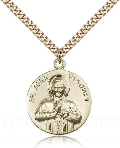 This St. John Vianney Medal is paired with a 24 inch stainless steel gold-tone heavy curb chain as pictured. All medals are gift boxed in a light blue velvet jewelry box ready for gift giving.