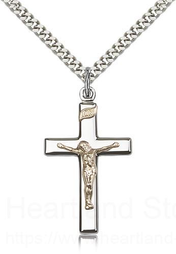 This Crucifix Pendant is paired with a 24 inch stainless steel heavy curb chain as pictured. All medals are gift boxed in a light blue velvet jewelry box ready for gift giving.