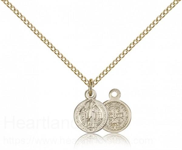 This St. Benedict Medal is paired with an 18" gold filled light curb chain as pictured. All medals are gift boxed in a light blue velvet gift box ready for gift giving.