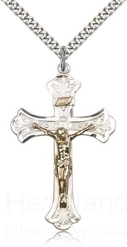 This Gold Filled and Sterling Silver Crucifix Pendant is paired with a 24 inch stainless steel heavy curb chain as pictured. All medals are gift boxed in a light blue velvet jewelry box ready for gift giving.