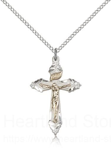 This Crucifix Pendant is paired with an 18 inch sterling silver lite curb chain as pictured. All medals are gift boxed in a light blue velvet jewelry box ready for gift giving.