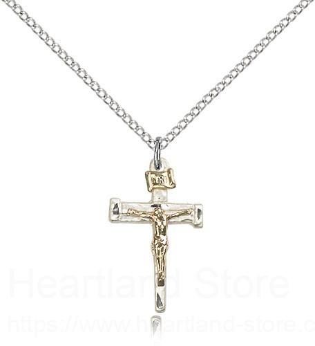 This Nail Crucifix Pendant is paired with an 18 inch sterling silver lite curb chain as pictured. All medals are gift boxed in a light blue velvet jewelry box ready for gift giving.