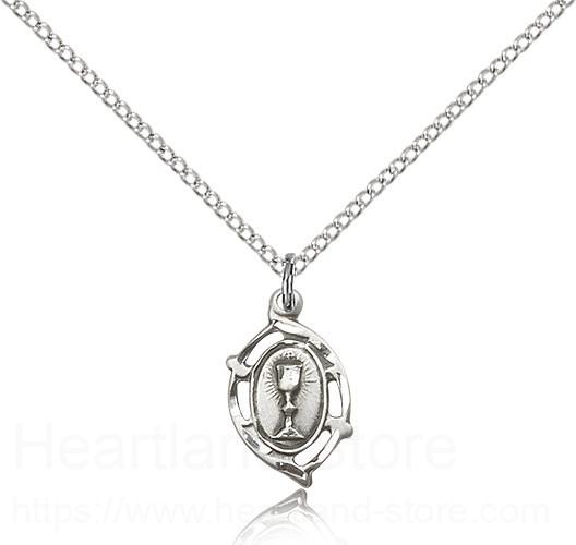 This Communion Medal is paired with an 18 inch sterling silver lite curb chain as pictured. All medals are gift boxed in a light blue velvet jewelry box ready for gift giving.