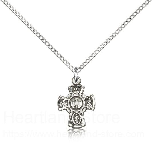 This 5 Way Cross Pendant is paired with an 18 inch sterling silver lite curb chain as pictured. All medals are gift boxed in a light blue velvet jewelry box ready for gift giving.
