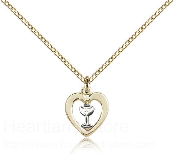 This Heart Chalice Medal is paired with an 18" gold filled light curb chain as pictured. All medals are gift boxed in a light blue velvet gift box ready for gift giving.