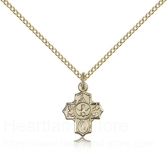 This 5 Way Cross Pendant is paired with an 18" gold filled light curb chain as pictured. All medals are gift boxed in a light blue velvet gift box ready for gift giving.