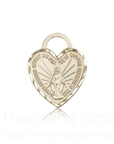 This Miraculous Heart Medal is made of 14 Karat Gold. The jewelry pendant is sold as pictured and does not come with a chain. All medals are gift boxed in a light blue velvet jewelry box ready for gift giving.