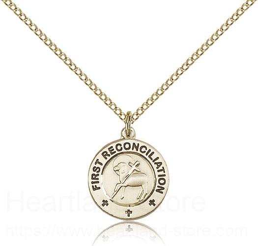 This First Reconciliation Penance Medal is paired with an 18" gold filled light curb chain as pictured. All medals are gift boxed in a light blue velvet gift box ready for gift giving.