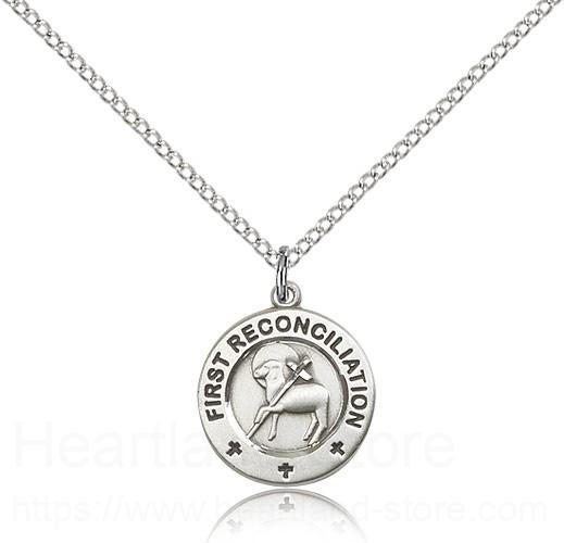 This First Reconciliation Penance Medal is paired with an 18 inch sterling silver lite curb chain as pictured. All medals are gift boxed in a light blue velvet jewelry box ready for gift giving.